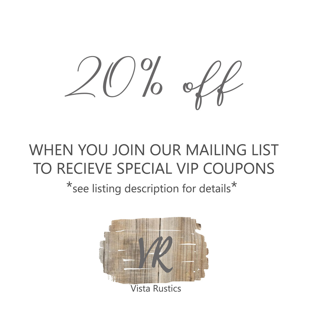 Sign up for our email list below to receive special VIP coupons and a 20% off Discount code right now!!